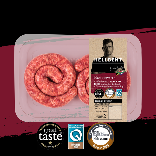Enjoy Hellbent Boerewors by cooking them gently in the oven for 20 minutes, turning once, or if you are feeling brave, fire up the BBQ and grill until it has turned a golden brown. Like any good beef, always leave to rest for a few minutes before eating. Serve in fresh bread rolls or with a salad for a simple, delicious high protein meal!